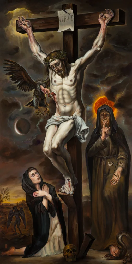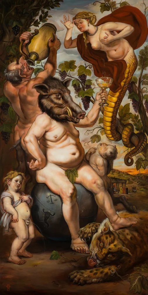It is truly awe-inspiring and humbling to behold this ambitious exhibit, comprised of twelve massive oil-on-wood-under-resin masterworks entitled "The Christ Chronocrater, Series III: The Reckoning". Seeing the show is akin to stepping into a sacred sanctuary where one can meditate on the struggles of mankind, which are dramatically played out in a series of vignettes. Ulrich's grand collection of allegorical work is based on the Zodiac and is laced with a mash-up of iconic symbolism, haunting imagery drawn from a variety of sources and larger than life subjects (Some recognizable and some open to interpretation).